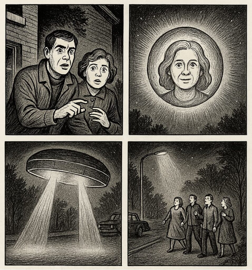 彼らがその球体を見上げて呆然としていると、さらに奇妙な光景が現れた。球体の中央に、40〜50歳ほどに見える穏やかで生き生きとした女性の顔が浮かび上がったのだ。その表情は優しく、まるでじっとこちらを見て微笑んでいるかのようだった。顔は約3分ほど浮かんでいたが、やがて静かに消え去った。球体自体は形をわずかに変えながら、同じ方向へゆっくりと動き続けた。まるで意思をもっているかのような挙動だった。